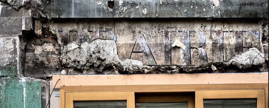 Fin du mystère des inscriptions partiellement lisibles apparues grâce à la rénovation de l’hôtel des 3 collèges, à l’angle des rues Cujas et Victor Cousin (Paris, Ve arrondissement), que j’évoquais ici-même les 20 juillet et 10 août dernier. John Faux, meilleur photographe et enquêteur plus perspicace que moi, de passage à Paris en septembre a photographié les mêmes vestiges typographiques et trouvé le fin mot de l’histoire. Merci à lui de m’en faire part et de m’autoriser à inclure ses photos dans ce billet.
